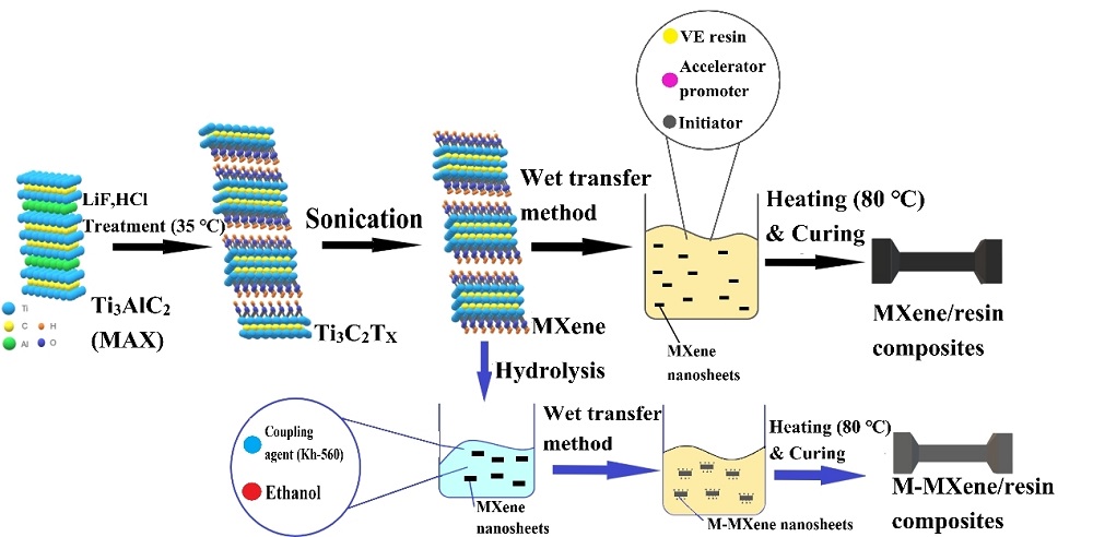 Two-dimensional nanosheets are highly effective tougheners for vinyl ester resins. The toughening effect is related to the high specific surface area and unique two-dimensional planar structure of the nanosheets. In this study, a coupling agent γ-(2,3-epoxypropoxy) propytrimethoxysilane (Kh-560) was used to modify MXene nanosheets (M-MXene) for use in toughening vinyl ester resin. The mechanical properties, including the tensile strength, flexural strength, Young’s modulus and elongation, of neat vinyl ester resin and vinyl ester resin modified with MXene and M-MXene were investigated. The results showed that modification significantly improved the mechanical properties of the vinyl ester resin. The tensile and flexural strengths of the MXene-nanosheet-modified vinyl ester resin were 27.20% and 25.32% higher, respectively, than those of the neat vinyl ester resin. The coupling agent improved the interfacial compatibility between the MXene nanosheets and vinyl ester resin, which resulted in the tensile and flexural strengths of the M-MXene-nanosheet-modified vinyl ester resin being 52.57% and 54.60% higher, respectively, than those of the neat vinyl ester resin for a loading quantity of nanosheets of only 0.04 wt %, which is economically viable. The main mechanisms by which the nanosheets toughen the resin are crack deflection and crack pinning.