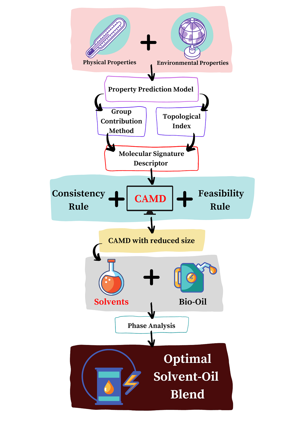 Direct application of bio-oil from fast pyrolysis as a fuel has remained a challenge due to its undesirable attributes such as low heating value, high viscosity, high corrosiveness and storage instability. Solvent addition is a simple method for circumventing these disadvantages to allow further processing and storage. In this work, computer-aided molecular design tools were developed to design optimal solvents to upgrade bio-oil whilst having low environmental impact. Firstly, target solvent requirements were translated into measurable physical properties. As different property prediction models consist different levels of structural information, molecular signature descriptor was used as a common platform to formulate the design problem. Because of the differences in the required structural information of different property prediction models, signatures of different heights were needed in formulating the design problem. Due to the combinatorial nature of higher-order signatures, the complexity of a computer-aided molecular design problem increases with the height of signatures. Thus, a multi-stage framework was developed by developing consistency rules that restrict the number of higher-order signatures. Finally, phase stability analysis was conducted to evaluate the stability of the solvent-oil blend. As a result, optimal solvents that improve the solvent-oil blend properties while displaying low environmental impact were identified.
