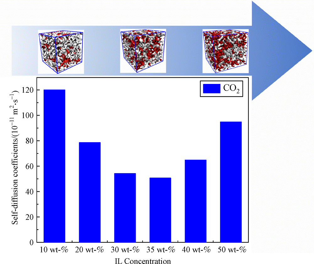 Ionic liquid (IL)/polyimide (PI) composite membranes demonstrate promise for use in CO2 separation applications. However, few studies have focused on the microscopic mechanism of CO2 in these composite systems, which is important information for designing new membranes. In this work, a series of systems of CO2 in 1-butyl-3-methylimidazolium bis(trifluoromethylsulfonyl)imide composited with 4,4-(hexafluoroisopropylidene) diphthalic anhydride (6FDA)-based PI, 6FDA-2,3,5,6-tetramethyl-1,4-phenylene-diamine, at different IL concentrations were investigated by all-atom molecular dynamics simulation. The formation of IL regions in PI was found, and the IL regions gradually became continuous channels with increasing IL concentrations. The analysis of the radial distribution functions and hydrogen bond numbers demonstrated that PI had a stronger interaction with cations than anions. However, the hydrogen bonds among PI chains were destroyed by the addition of IL, which was favorable for transporting CO2. Furthermore, the self-diffusion coefficient and free energy barrier suggested that the diffusion coefficient of CO2 decreased with increasing IL concentrations up to 35 wt-% due to the decrease of the fractional free volume of the composite membrane. However, the CO2 self-diffusion coefficients increased when the IL contents were higher than 35 wt-%, which was attributed to the formation of continuous IL domain that benefitted the transportation of CO2.