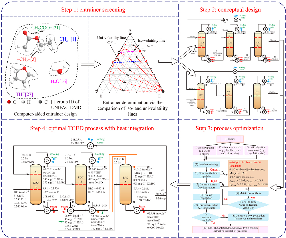 An energy-efficient triple-column extractive distillation process is developed for recovering tetrahydrofuran and ethyl acetate from industrial effluent. The process development follows a rigorous hierarchical design procedure that involves entrainer design, thermodynamic analysis, process design and optimization, and heat integration. The computer-aided molecular design method is firstly used to find promising entrainer candidates and the best one is determined via rigorous thermodynamic analysis. Subsequently, the direct and indirect triple-column extractive distillation processes are proposed in the conceptual design step. These two extractive distillation processes are then optimized by employing an improved genetic algorithm. Finally, heat integration is performed to further reduce the process energy consumption. The results indicate that the indirect extractive distillation process with heat integration shows the highest performance in terms of the process economics.