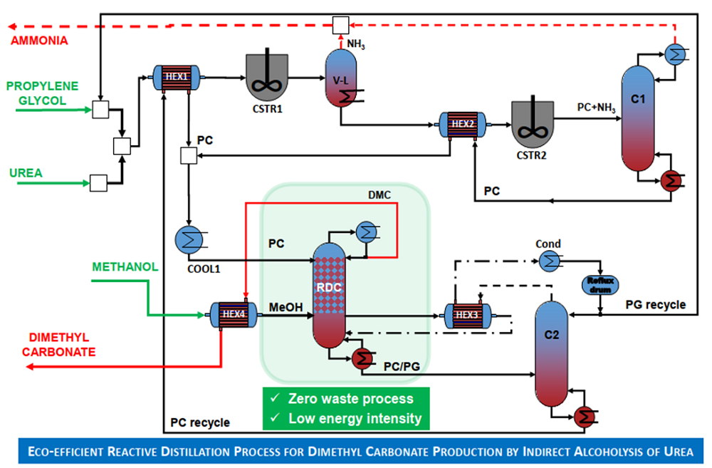 Dimethyl carbonate is an eco-friendly essential chemical that can be sustainably produced from CO2, which is available from carbon capture activities or can even be captured from the air. The rapid increase in dimethyl carbonate demand is driven by the fast growth of polycarbonates, solvent, pharmaceutical, and lithium-ion battery industries. Dimethyl carbonate can be produced from CO2 through various chemical pathways, but the most convenient route reported is the indirect alcoholysis of urea. Previous research used techniques such as heat integration and reactive distillation to reduce the energy use and costs, but the use of an excess of methanol in the trans-esterification step led to an energy intensive extractive distillation required to break the dimethyl carbonate-methanol azeotrope. This work shows that the production of dimethyl carbonate by indirect alcoholysis of urea can be improved by using an excess of propylene carbonate (instead of an excess of methanol), a neat feat that we showed it requires only 2.64 kW·h·kg–1 dimethyl carbonate in a reaction-separation-recycle process, and a reactive distillation column that effectively replaces two conventional distillation columns and the reactor for dimethyl carbonate synthesis. Therefore, less equipment is required, the methanol-dimethyl carbonate azeotrope does not need to be recycled, and the overall savings are higher. Moreover, we propose the use of a reactive distillation column in a heat integrated process to obtain high purity dimethyl carbonate (>99.8 wt-%). The energy requirement is reduced by heat integration to just 1.25 kW·h·kg–1 dimethyl carbonate, which is about 52% lower than the reaction-separation-recycle process. To benefit from the energy savings, the dynamics and control of the process are provided for ±10% changes in the nominal rate of 32 ktpy dimethyl carbonate, and for uncertainties in reaction kinetics.