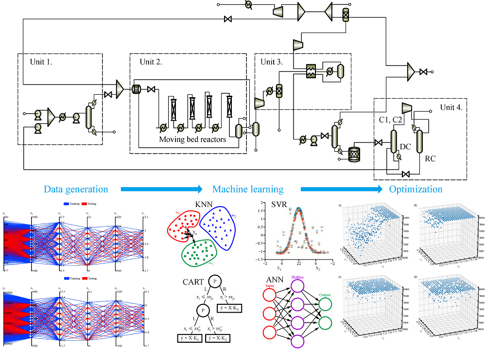 Modeling and optimization is crucial to smart chemical process operations. However, a large number of nonlinearities must be considered in a typical chemical process according to complex unit operations, chemical reactions and separations. This leads to a great challenge of implementing mechanistic models into industrial-scale problems due to the resulting computational complexity. Thus, this paper presents an efficient hybrid framework of integrating machine learning and particle swarm optimization to overcome the aforementioned difficulties. An industrial propane dehydrogenation process was carried out to demonstrate the validity and efficiency of our method. Firstly, a data set was generated based on process mechanistic simulation validated by industrial data, which provides sufficient and reasonable samples for model training and testing. Secondly, four well-known machine learning methods, namely, K-nearest neighbors, decision tree, support vector machine, and artificial neural network, were compared and used to obtain the prediction models of the processes operation. All of these methods achieved highly accurate model by adjusting model parameters on the basis of high-coverage data and properly features. Finally, optimal process operations were obtained by using the particle swarm optimization approach.