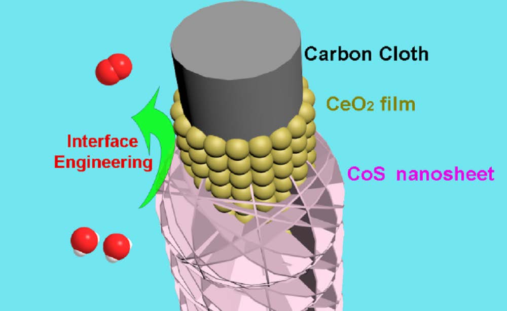 To realize renewable energy conversion, it is important to develop low-cost and high-efficiency electrocatalyst for oxygen evolution reaction. In this communication, a novel bijunction CoS/CeO2 electrocatalyst grown on carbon cloth is prepared by the interface engineering. The interface engineering of CoS and CeO2 facilitates a rapid charge transfer from CeO2 to CoS. Such an electrocatalyst exhibits outstanding electrocatalytic activity with a low overpotential of 311 mV at 10 mA∙cm−2 and low Tafel slope of 76.2 mV∙dec–1, and is superior to that of CoS (372 mV) and CeO2 (530 mV) counterparts. And it has long-term durability under alkaline media.