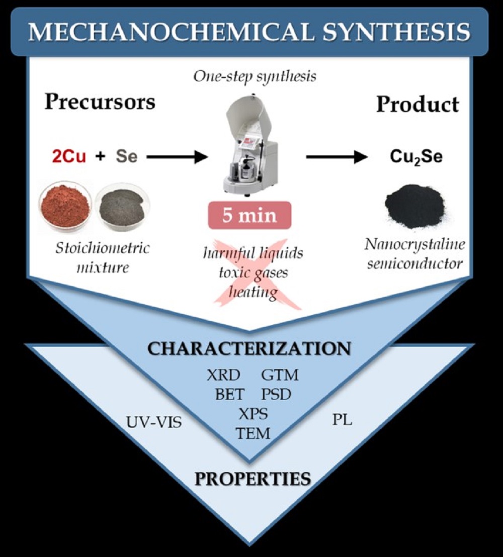 Copper(I) selenide-nanocrystalline semiconductor was synthesized via one-step mechanochemical synthesis after 5 min milling in a planetary ball mill. The kinetics of synthesis was followed by X-ray powder diffraction analysis and specific surface area measurements of milled 2Cu/Se mixtures. The X-ray diffraction confirmed the orthorhombic crystal structure of Cu2Se with the crystallite size ~25 nm. The surface chemical structure was studied by X-ray photoelectron spectroscopy, whereby the binding energy of the Cu 2p and Se 3d signals corresponded to Cu+ and Se2– oxidation states. Transmission electron microscopy revealed agglomerated nanocrystals and confirmed their orthorhombic structure, as well. The optical properties were studied utilizing ultraviolet-visible spectroscopy and photoluminescence spectroscopy. The direct bandgap energy 3.7 eV indicated a blue-shift phenomenon due to the quantum size effect. This type of Cu2Se synthesis can be easily adapted to production dimensions using an industrial vibratory mill. The advantages of mechanochemical synthesis represent the potential for inexpensive, environmentally-friendly, and waste-free manufacturing of Cu2Se.