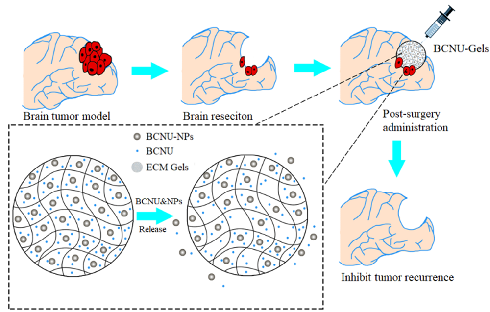 Many scientific efforts have been made to penetrate the blood-brain barrier and target glioblastoma cells, but the outcomes have been limited. More attention should be given to local inhibition of recurrence after glioblastoma resection to meet real medical needs. A biodegradable wafer containing the chemotherapeutics carmustine (1,3-bis(2-chloroethyl)-1-nitrosourea, BCNU) was the only local drug delivery system approved for clinical glioblastoma treatment, but with a prolonged survival time of only two months and frequent side effects. In this study, to improve the sustained release and prolonged therapeutic effect of drugs for inhibiting tumor recurrence after tumor resection, both free BCNU and BCNU- poly (lactic-co-glycolic acid) (the ratio of lactic acid groups to glycolic acid groups is 75/25) nanoparticles were simultaneously loaded into natural extracellular matrix hydrogel from pigskin to prepare BCNU gels. The hydrogel was injected into the resection cavity of a glioblastoma tumor immediately after tumor removal in a fully characterized resection rat model. Free drugs were released instantly to kill the residual tumor cells, while drugs in nanoparticles were continuously released to achieve a continuous and effective inhibition of the residual tumor cells for 30 days. These combined actions effectively restricted tumor growth in rats. Thus, this strategy of local drug implantation and delivery may provide a reliable method to inhibit the recurrence of glioblastoma after tumor resection in vivo.
