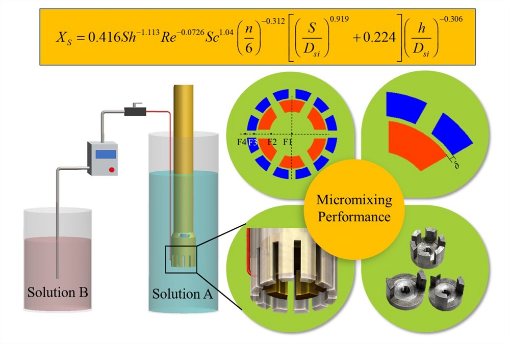 Semi-batch operated reaction processes are necessary for some competitive reaction systems to achieve a desirable process selectivity and productivity of fine chemical products. Herein the structural and operating parameters of the teethed high shear mixers were adjusted to study the micromixing performance in the semi-batch operated system, using the Villermaux/Dushman reaction system. The results indicate that the rising of the rotor speed and the number of rotor teeth, the decrease of the width of the shear gap and the radial distance between the feed position and the inner wall of stator can enhance the micromixing level and lead to the decrease of the segregation index. Additionally, computational fluid dynamics calculations were carried out to disclose the evolution of the flow pattern and turbulent energy dissipation rate of the semi-batch operated high shear mixer. Furthermore, the correlation was established with a mean relative error of 8.05% and R2 of 0.955 to fit the segregation index and the parameters studied in this work, which can provide valuable guidance on the design and optimization of the semi-batch operated high shear mixers in practical applications.