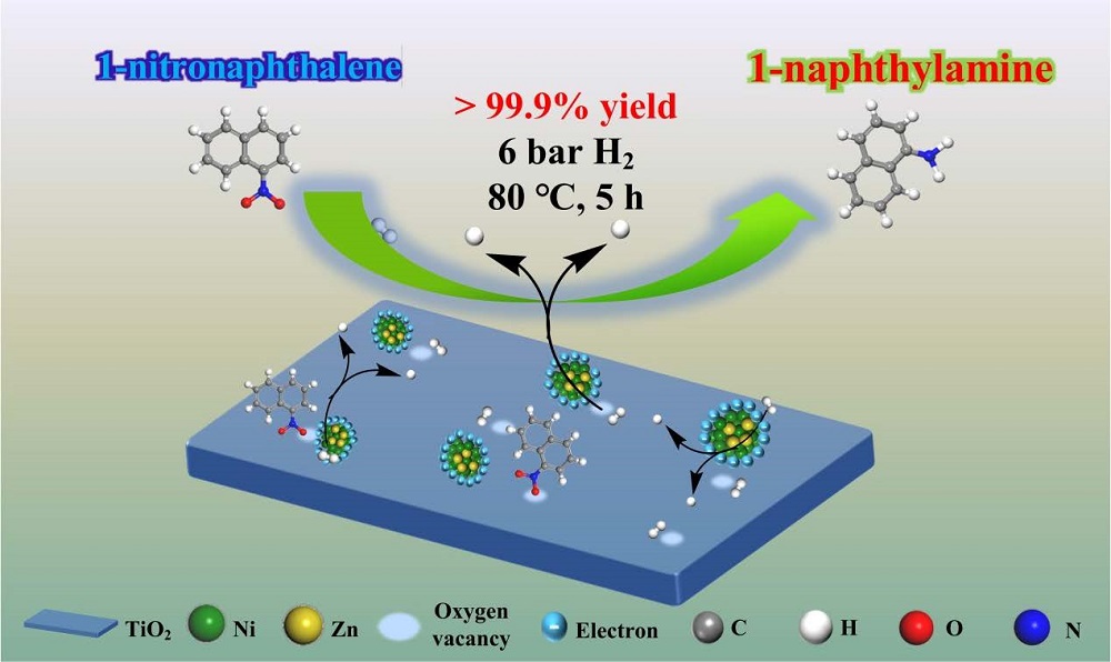 The catalytic hydrogenation of nitroaromatics is an environmentally friendly technology for aniline production, and it is crucial to develop noble-metal-free catalysts that can achieve chemoselective hydrogenation of nitroaromatics under mild reaction conditions. In this work, zinc-modified Ni-Ti catalysts (NixZnyTi1) were fabricated and applied for the hydrogenation of nitroaromatics hydrogenation. It was found that the introduction of zinc effectively increases the surface Ni density, enhances the electronic effect, and improves the interaction between Ni and TiO2, resulting in smaller Ni particle size, more oxygen vacancies, higher dispersion and greater concentration of Ni on the catalyst surface. Furthermore, the electron-rich Niδ– obtained by electron transfer from Zn and Ti to Ni effectively adsorbs and dissociates hydrogen. The results reveal that NixZnyTi1 (Ni0.5Zn0.5Ti1) shows excellent catalytic performance under mild conditions (70 °C and 6 bar). These findings provide a rational strategy for the development of highly active non-noble-metal hydrogenation catalysts.