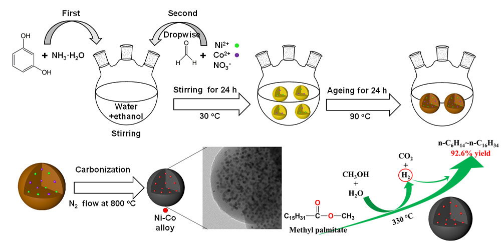 Carbon-coated Ni, Co and Ni-Co alloy catalysts were prepared by the carbonization of the metal doped resorcinol-formaldehyde resins synthesized by the one-pot extended Stöber method. It was found that the introduction of Co remarkably reduced the carbon microsphere size. The metallic Ni, Co, and Ni-Co alloy particles (mainly 10–12 nm) were uniformly distributed in carbon microspheres. A charge transfer from Ni to Co appeared in the Ni-Co alloy. Compared with those of metallic Ni and Co, the d-band center of the Ni-Co alloy shifted away from and toward the Fermi level, respectively. In the in-situ aqueous phase hydrodeoxygenation of methyl palmitate with methanol as the hydrogen donor at 330 °C, the decarbonylation/decarboxylation pathway dominated on all catalysts. The Ni-Co@C catalysts gave higher activity than the Ni@C and Co@C catalysts, and the yields of n-pentadecane and n-C6–n-C16 reached 71.6% and 92.6%, respectively. The excellent performance of Ni-Co@C is attributed to the electronic interactions between Ni and Co and the small carbon microspheres. Due to the confinement effect of carbon, the metal particles showed high resistance to sintering under harsh hydrothermal conditions. Catalyst deactivation is due to the carbonaceous deposition, and the regeneration with CO2 recovered the catalyst reactivity.