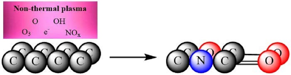 Surface functionalization or modification to introduce more oxygen-containing functional groups to biochar is an effective strategy for tuning the physicochemical properties and promoting follow-up applications. In this study, non-thermal plasma was applied for biochar surface carving before being used in contaminant removal and energy storage applications. The results showed that even a low dose of plasma exposure could introduce a high number density of oxygen-functional groups and enhance the hydrophilicity and metal affinity of the pristine biochar. The plasma-treated biochar enabled a faster metal-adsorption rate and a 40% higher maximum adsorption capacity of heavy metal ion Pb2+. Moreover, to add more functionality to biochar surface, biochar with and without plasma pre-treatment was activated by KOH at a temperature of 800 °C. Using the same amount of KOH, the plasma treatment resulted in an activated carbon product with the larger BET surface area and pore volume. The performance of the treated activated carbon as a supercapacitor electrode was also substantially improved by>30%. This study may provide guidelines for enhancing the surface functionality and application performances of biochar using non-thermal-based techniques.