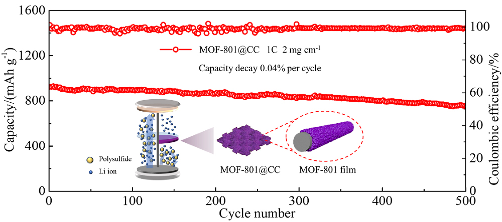 Lithium-sulfur batteries have been regarded as the next-generation rechargeable batteries due to their high theoretical energy density and specific capacity. Nevertheless, the shuttle effect of lithium polysulfides has hindered the development of lithium-sulfur batteries. Herein, a novel zirconium-based metal-organic framework-801 film on carbon cloth was developed as a versatile interlayer for lithium-sulfur batteries. This interlayer has a hierarchical porous structure, suitable for the immobilization of lithium polysulfides and accommodating volume expansion on cycling. Moreover, the MOF-801 material is capable of strongly adsorbing lithium polysulfides and promoting their catalytic conversion, which can be enhanced by the abundant active sites provided by the continuous structure of the MOF-801 films. Based on the above advantages, the lithium-sulfur battery, with the proposed interlayer, delivers an initial discharge capacity of 927 mAh·g–1 at 1 C with an extremely low decay rate of 0.04% over 500 cycles. Additionally, a high area capacity of 4.3 mAh·cm–2 can be achieved under increased S loading.