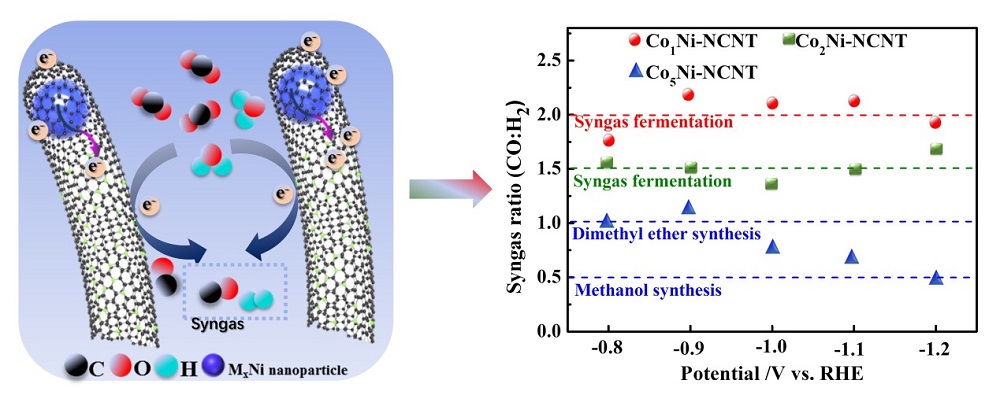 The electrochemical conversion of CO2-H2O into CO-H2 using renewable energy is a promising technique for clean syngas production. Low-cost electrocatalysts to produce tunable syngas with a potential-independent CO/H2 ratio are highly desired. Herein, a series of N-doped carbon nanotubes encapsulating binary alloy nanoparticles (MxNi-NCNT, M= Fe, Co) were successfully fabricated through the co-pyrolysis of melamine and metal precursors. The MxNi-NCNT samples exhibited bamboo-like nanotubular structures with a large specific surface area and high degree of graphitization. Their electrocatalytic performance for syngas production can be tuned by changing the alloy compositions and modifying the electronic structure of the carbon nanotube through the encapsulated metal nanoparticles. Consequently, syngas with a wide range of CO/H2 ratios, from 0.5:1 to 3.4:1, can be produced on MxNi-NCNT. More importantly, stable CO/H2 ratios of 2:1 and 1.5:1, corresponding to the ratio to produce biofuels by syngas fermentation, could be realized on Co1Ni-NCNT and Co2Ni-NCNT, respectively, over a potential window of –0.8 to –1.2 V versus the reversible hydrogen electrode. Our work provides an approach to develop low-cost and potential-independent electrocatalysts to effectively produce syngas with an adjustable CO/H2 ratio from electrochemical CO2 reduction.
