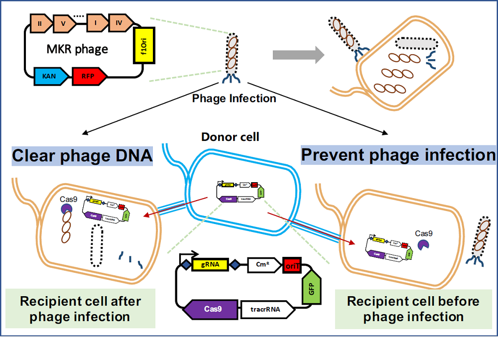 Escherichia coli is one of the most important microbial cell factories, but infection by bacteriophages in the environment may have a huge impact on its application in industrial production. Here, we developed a mobile CRISPR-Cas9 based anti-phage system for bacteriophages defense in E. coli. Two conjugative plasmids pGM1 (phosphoglucomutase 1) and pGM2 carrying one and two guide RNAs, respectively, were designed to defend against a filamentous phage. The results showed that the pGM1 and pGM2 could decrease the phage infection rate to 1.6% and 0.2% respectively in infected cells. For preventing phage infection in E. coli, the pGM2 decreased the phage infection rate to 0.1%, while pGM1 failed to block phage infection. Sequence verification revealed that point mutations in protospacer or protospacer adjacent motif sequences of the phage genome caused loss of the defense function. These results support the potential application of MCBAS in E. coli cell factories to defend against phage infections.