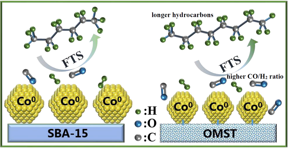 Ordered SBA-15 mesoporous silica with incorporated titanium was successfully synthesized via a one-pot hydrothermal crystallization method. The characterization including powder X-ray diffraction, Brunauer–Emmett–Teller, transmission electron microscope, temperature-programmed reduction, temperature-programmed desorption, Fourier transform infrared and ultraviolet-visible-near infrared spectrometer was performed to explore the physical and chemical structures of both the supports and the catalysts. The results showed that titanium was successfully incorporated into the mesoporous silica framework with a limited amount of titanium (Si/Ti > 20), and the mesoporous structure was retained. However, the increased titanium content inevitably resulted in the formation of anatase TiO 2 particles on the support surface. The increased incorporated titanium strengthened the interactions between cobalt species and supports, which was favorable for the cobalt species dispersion, despite the limited cobalt oxide reducibility. The enhanced metal-support interactions were beneficial for the CO/H2 ratio at the active cobalt sites, which facilitated the formation of more C5+ hydrocarbons. This study provides a promising method for support modification with incorporated-heteroatoms for the rational development of Fischer–Tropsch catalysts.