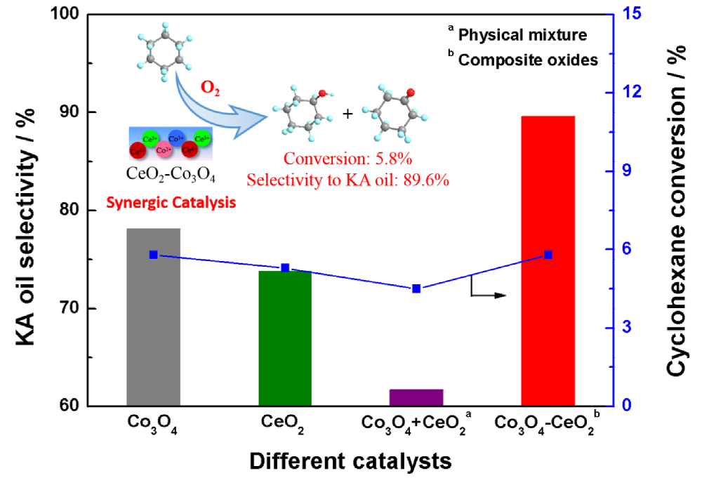 The one-step highly selective oxidation of cyclohexane into cyclohexanone and cyclohexanol as the essential intermediates of nylon-6 and nylon-66 is considerably challenging. Therefore, an efficient and low-cost catalyst must be urgently developed to improve the efficiency of this process. In this study, a Co3O4–CeO2 composite oxide catalyst was successfully prepared through ultrasound-assisted co-precipitation. This catalyst exhibited a higher selectivity to KA-oil, which was benefited from the synergistic effects between Co3+/Co2+ and Ce4+/Ce3+ redox pairs, than bulk CeO2 and/or Co3O4. Under the optimum reaction conditions, 89.6% selectivity to KA-oil with a cyclohexane conversion of 5.8% was achieved over Co3O4–CeO2. Its catalytic performance remained unchanged after five runs. Using the synergistic effects between the redox pairs of different transition metals, this study provides a feasible strategy to design high-performance catalysts for the selective oxidation of alkanes.
