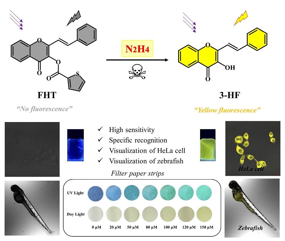 Hydrazine is extremely toxic and causes severe harm to human body. Herein, a novel fluorescent probe 4-oxo-2-styryl-4H-chromen-3-yl thiophene-2-carboxylate (FHT) was synthesized for detecting hydrazine by using natural cinnamaldehyde as starting material. This probe exhibited significantly enhanced fluorescence response towards hydrazine over various common metal ions, anions, and amine compounds. The detection limit of probe FHT for hydrazine was as low as 0.14 μmol·L–1, significantly lower than that of the threshold value of 0.312 μmol·L–1, imposed by the Environmental Protection Agency. Moreover, the proposed probe was able to detect hydrazine within wide pH (5–10) and linear detection ranges (0–110 μmol·L–1). This probe was employed for determining trace hydrazine in different environmental water samples. The probe FHT-loaded filter paper strips were able to conveniently detect hydrazine of low concentration through distinct naked-eye and fluorescent color changes. Importantly, the probe FHT with low cytotoxicity was successfully applied to visualize hydrazine in living Hela cells and zebrafish.