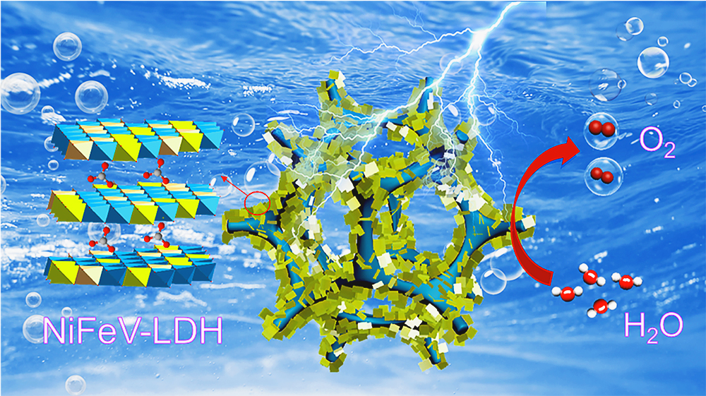 High-performance and stable electrocatalysts are vital for the oxygen evolution reaction (OER). Herein, via a one-pot hydrothermal method, Ni/Fe/V ternary layered double hydroxides (NiFeV-LDH) derived from Ni foam are fabricated to work as highly active and durable electrocatalysts for OER. By changing the feeding ratio of Fe and V salts, the prepared ternary hydroxides were optimized. At an Fe:V ratio of 0.5:0.5, NiFeV-LDH exhibits outstanding OER activity superior to that of the binary hydroxides, requiring overpotentials of 269 and 274 mV at 50 mA·cm–2 in the linear sweep voltammetry and sampled current voltammetry measurements, respectively. Importantly, NiFeV-LDH shows extraordinary long-term stability (≥ 75 h) at an extremely high current density of 200 mA·cm–2. In contrast, the binary hydroxides present quick decay at 200 mA·cm–2 or even reduced current densities (150 and 100 mA·cm–2). The outstanding OER performance of NiFeV-LDH benefits from the synergistic effect of V and Fe while doping the third metal into bimetallic hydroxide layers: (a) Fe plays a crucial role as the active site; (b) electron-withdrawing V stabilizes the high valence state of Fe, thus accelerating the OER process; (c) V further offers great stabilization for the formed intermediate of FeOOH, thus achieving superior durability.