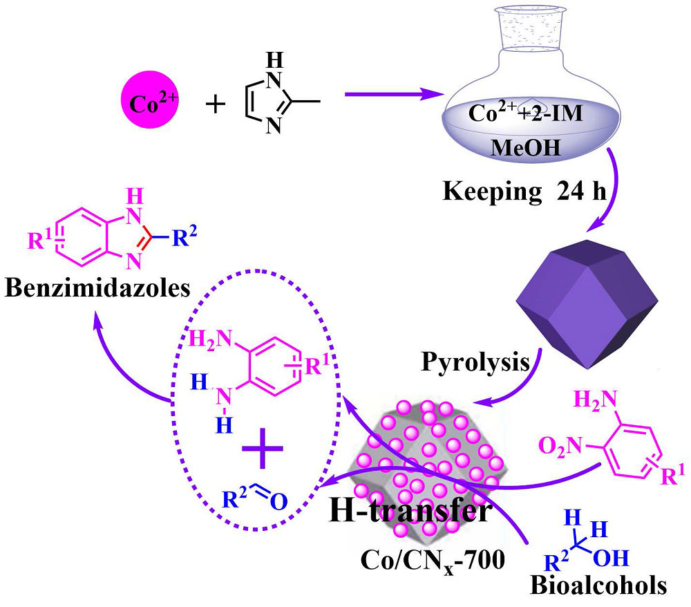 Benzimidazole derivatives have wide-spectrum biological activities and pharmacological effects, but remain challenging to be produced from biomass feedstocks. Here, we report a green hydrogen transfer strategy for the efficient one-pot production of benzimidazoles from a wide range of bio-alcohols and o-nitroanilines enabled by cobalt nitride species on hierarchically porous and recyclable nitrogen-doped carbon catalysts (Co/CNx-T, T denotes the pyrolysis temperature) without using an external hydrogen source and base additive. Among the tested catalysts, Co/CNx-700 exhibited superior catalytic performance, furnishing 2-substituted benzimidazoles in 65%–92% yields. Detailed mechanistic studies manifest that the coordination between Co2+ and N with appropriate electronic state on the porous nitrogen-doped carbon having structural defects, as well as the remarkable synergetic effect of Co/N dual sites contribute to the pronounced activity of Co/CNx-700, while too high pyrolysis temperature may cause the breakage of the catalyst Co–N bond to lower down its activity. Also, it is revealed that the initial dehydrogenation of bio-alcohol and the subsequent cyclodehydrogenation are closely correlated with the hydrogenation of nitro groups. The catalytic hydrogen transfer-coupling protocol opens a new avenue for the synthesis of N-heterocyclic compounds from biomass.