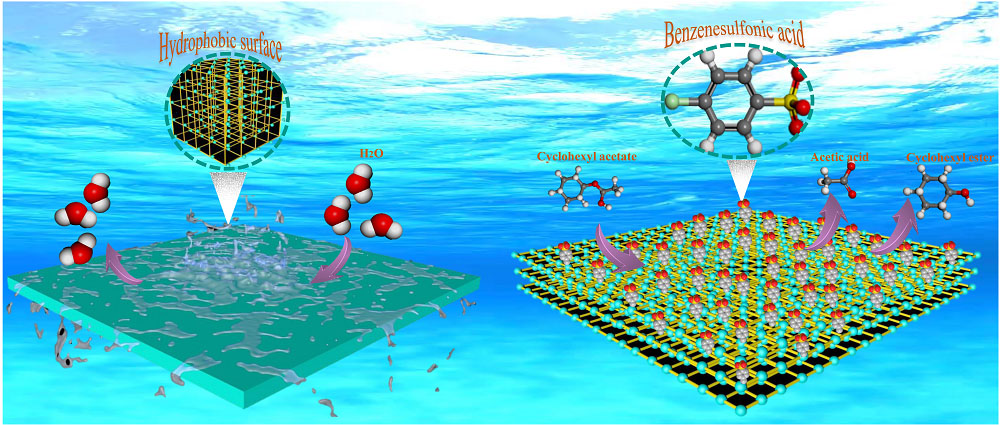Hydrothermal and catalytic stability of UIO-66 MOFs with defective structures are critical aspects to be considered in their catalytic applications, especially under the conditions involving water, moisture and/or heat. Here, we report a facile strategy to introduce the macromolecular acid group to UIO-66 to improve the stability of the resulting UIO-66−PhSO 3H MOF in aqueous phase catalysis. In detail, UIO-66−PhSO 3H was obtained by grafting benzenesulfonic acid on the surface of the pristine UIO-66 to introduce the hydrophobicity, as well as the Brønsted acidity, then assessed using catalytic hydrolysis of cyclohexyl acetate (to cyclohexanol) in water. The introduction of hydrophobic molecules to UIO-66 could prevent the material from being attacked by hydroxyl polar molecules effectively, explaining its good structural stability during catalysis. UIO-66−PhSO 3H promoted the conversion of cyclohexyl acetate at ca. 87%, and its activity and textural properties were basically intact after the cyclic stability tests. The facile modification strategy can improve the hydrothermal stability of UIO-66 significantly, which can expand its catalytic applications in aqueous systems.