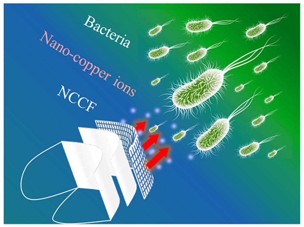 The current SARS-CoV-2 pandemic has resulted in the widespread use of personal protective equipment, particularly face masks. However, the use of commercial disposable face masks puts great pressure on the environment. In this study, nano-copper ions assembled cotton fabric used in face masks to impart antibacterial activity has been discussed. To produce the nanocomposite, the cotton fabric was modified by sodium chloroacetate after its mercerization, and assembled with bactericidal nano-copper ions (about 10.61 mg·g–1) through electrostatic adsorption. It demonstrated excellent antibacterial activity against Staphylococcus aureus and Escherichia coli because the gaps between fibers in the cotton fabric allow the nano-copper ions to be fully released. Moreover, the antibacterial efficiency was maintained even after 50 washing cycles. Furthermore, the face mask constructed with this novel nanocomposite upper layer exhibited a high particle filtration efficiency (96.08% ± 0.91%) without compromising the air permeability (28.9 min·L–1). This green, economical, facile, and scalable process of depositing nano-copper ions onto modified cotton fibric has great potential to reduce disease transmission, resource consumption, and environmental impact of waste, while also expanding the range of protective fabrics.