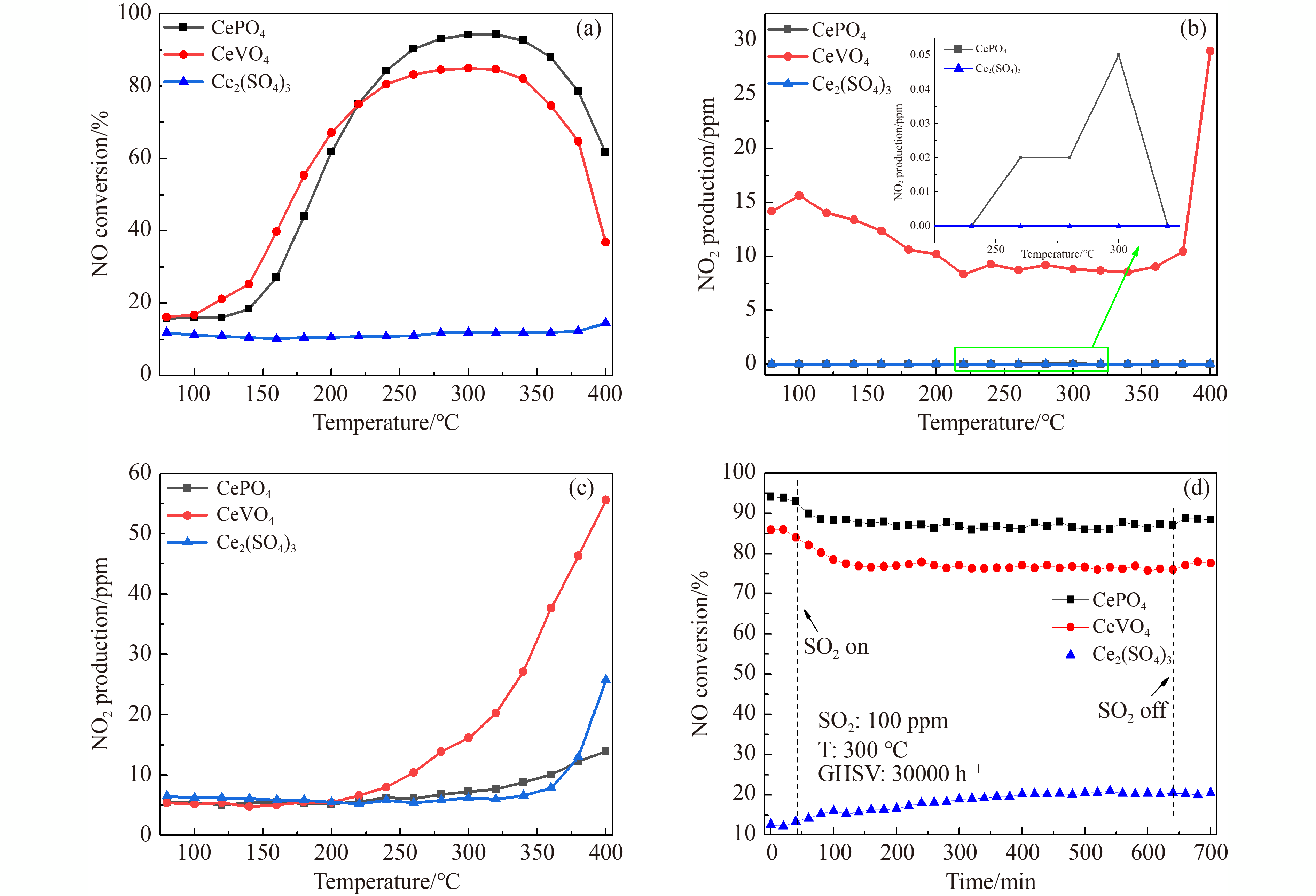 Three kinds of Ce-based catalysts (CePO4, CeVO4, Ce2(SO4)3) were synthesized and used for the selective catalytic reduction (SCR) of NO by NH3. NH3-SCR performances were conducted in the temperature range of 80 to 400 °C. The catalytic efficiencies of the three catalysts are as follow: CePO4 > CeVO4 > Ce2(SO4)3, which is in agreement with their abilities of NH3 adsorption capacities. The highest NO conversion rate of CePO4 could reach about 95%, and the catalyst had more than 90% NO conversion rate between 260 and 320 °C. The effect of PO43–, VO43– and SO42– on NH3-SCR performances of Ce-based catalysts was systematically investigated by the X-ray photoelectron spectroscopy analysis, NH3 temperature programmed desorption, H2 temperature programmed reduction and field emission scanning electron microscopy tests. The key factors that can enhance the SCR are the existence of Ce4+, large NH3 adsorption capacity, high and early H2 consumptions, and suitable microstructures for gas adsorption. Finally, CePO4 and CeVO4 catalysts also exhibited relatively strong tolerance of SO2, and the upward trend about 8% was detected due to the sulfation enhancement by SO2 for Ce2(SO4)3.