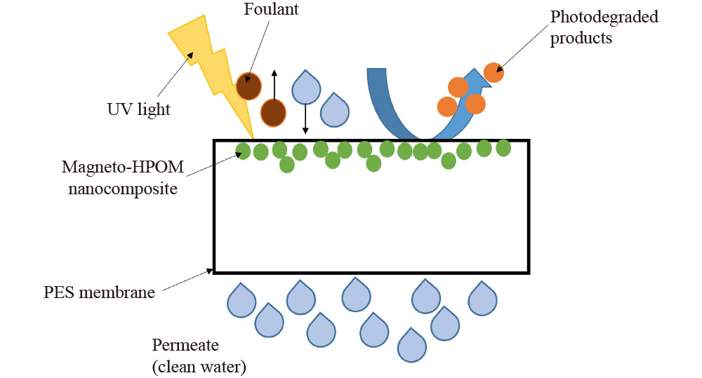 Membrane technology is ideal for removing aqueous humic acid, but humic acid deposits cause membrane fouling, a significant challenge that limits its application. Herein, this work proposed an alternative approach to the controllably magnetically induced magneto-hybrid polyoxometalate (magneto-HPOM) nanocomposite migration toward the polyethersulfone (PES) membrane surface under a magnetic field to enhance the self-cleaning and antifouling functionalities of the membrane. Before incorporating magneto-HPOM nanocomposite into the PES casting solution, functionalized magnetite nanoparticles (F-MNP) were first coated with HPOM photocatalyst to fabricate a magneto-HPOM-PES membrane. It was shown that the apparent impacts of this novel magneto-HPOM-PES membrane on the hydrophilic behavior and photocatalytic properties of the magneto-HPOM nanocomposite improve the hydrophilicity, separation performance, antifouling and self-cleaning properties of the membrane compared with neat PES membrane. Furthermore, after exposure to ultraviolet light, the magneto-HPOM-PES membrane can be recovered after three cycles with a flux recovery ratio of 107.95%, 100.06%, and 95.56%, which is attributed to the temporal super hydrophilicity effect. Meanwhile, the magneto-HPOM-PES membrane could efficiently maintain 100% humic acid rejection for the first and second cycles and 99.81% for the third cycle. This study revealed a novel approach to fabricating membranes with high antifouling and self-cleaning properties for water treatment.