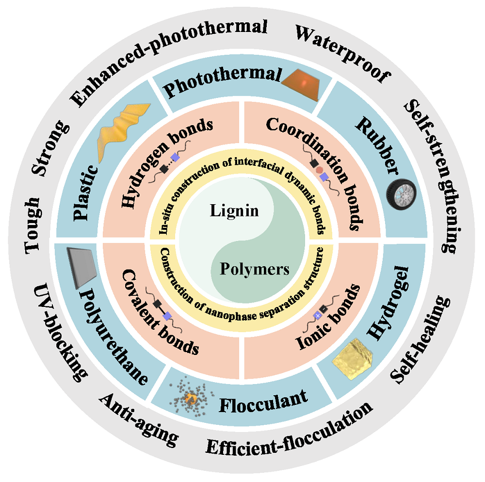 Lignin is the largest natural aromatic biopolymer, but usually treated as industrial biomass waste. The development of lignin/polymer biocomposites can promote the high value utilization of lignin and the greening of polymers. However, the weak interfacial interaction between industrial lignin and polymer induces poor compatibility and serious agglomeration in polymer owing to the strong intermolecular force of lignin. As such, it is extremely difficult to prepare high performance lignin/polymer biocomposites. Recently, we proposed the strategy of in situ construction of interfacial dynamic bonds in lignin/polymer composites. By taking advantage of the abundant oxygen-containing polar groups of lignin, we inserted dynamic bonding connection such as hydrogen bonds and coordination bonds into the interphase between lignin and the polymer matrix to improve the interfacial interactions. Meanwhile, the natural amphiphilic structure characteristics of lignin were utilized to construct the hierarchical nanophase separation structure in lignin/polymer composites. The persistent problems of poor dispersity and interfacial compatibility of lignin in the polymer matrix were effectively solved. The lignin-modified polymer composites achieved simultaneously enhanced strength and toughness. This concise review systematically summarized the recent research progress of our group toward building high-performance lignin/polymer biocomposites through the design of interfacial dynamic bonds (hydrogen bonds, coordination bonds, and dynamic covalent bonds) between lignin and different polymer systems (polar plastics, rubber, polyurethane, hydrogels, and other polymers). Finally, the future development direction, main challenges, and potential solutions of lignin application in polymers were presented.