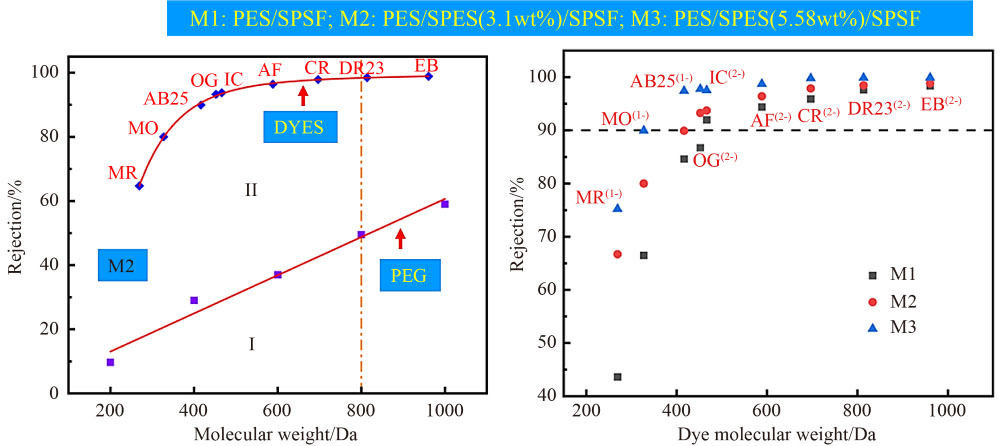 Herein, polyethersulfone (PES) and sulfonated polysulfone (SPSf) blend membranes were prepared with addition of sulfonated polyethersulfone (SPES) as a hydrophilic polymer and adipic acid as a porogen via non-solvent induced phase separation method for effective fractionation of dyes based on the influence of steric hindrance and charge effect. Raman spectroscopy and molecular dynamic simulation modeling confirmed that hydrogen bonds between PES, SPSf, SPES, and adipic acid were crucial to membrane formation and spatial arrangement. Further addition of hydrophilic SPES resulted in a membrane with reduced pore size and molecular weight cut-off as well as amplified negative charge and pure water permeance. During separation, the blend membranes exhibited higher rejection rates for nine types of small molecular weight (269.3–800 Da) dyes than for neutral polyethylene glycol molecules (200–1000 Da). This was attributed to the size effect and the synergistic effect between steric hindrance and charge repulsion. Notably, the synergistic impact decreased with dye molecular weight, while greater membrane negative charge enhanced small molecular dye rejection. Ideal operational stability and anti-fouling performance were best observed in M2 (PES/SPSf/SPES, 3.1 wt %). Summarily, this study demonstrates that SPES with –SO3‒ functional groups can be applied to control the microstructure and separation of membranes.