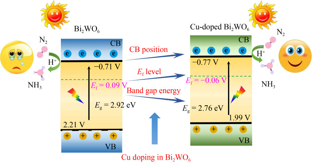 In this paper, Cu-doped Bi2WO6 was synthesized via a solvothermal method and applied it in photocatalytic N2 immobilization. Characterization results showed the presence of a small amount of metallic Bi in the photocatalyst, indicating that the synthesized photocatalyst is actually Bi/Cu-Bi2WO6 composite. The doped Cu had a valence state of +2 and most likely substituted the position of Bi3+. The introduced Cu did not affect the metallic Bi content, but mainly influenced the energy band structure of Bi2WO6. The band gap was slightly narrowed, the conduction band was elevated, and the work function was reduced. The reduced work function improved the transfer and separation of charge carriers, which mainly caused the increased photoactivity. The optimized NH3 generation rates of Bi/Cu-Bi2WO6 reached 624 and 243 μmol·L–1·g–1·h–1 under simulated solar and visible light, and these values were approximately 2.8 and 5.9 times higher those of Bi/Bi2WO6, respectively. This research provides a method for improving the photocatalytic N2 fixation and may provide more information on the design and preparation of heteroatom-doped semiconductor photocatalysts for N2-to-NH3 conversion.