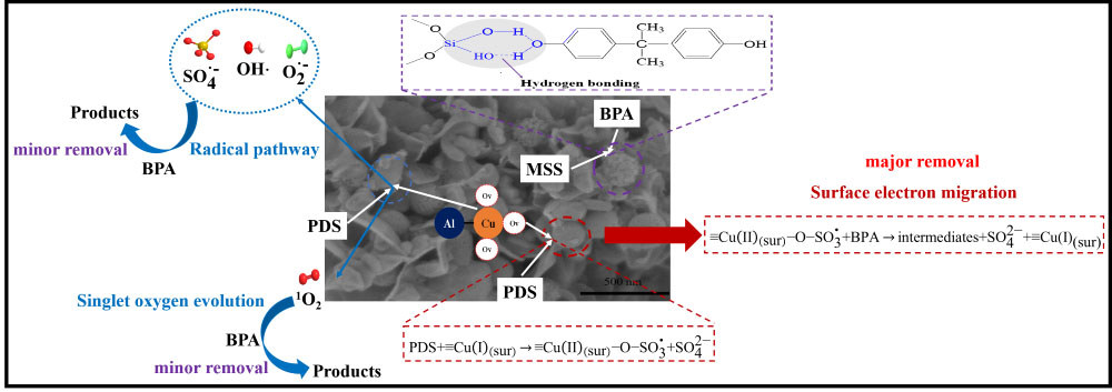Herein, Cu–Al bimetallic oxide was synthesized and mixed with mesoporous silica spheres via a simple hydrothermal method. The prepared sample was then analyzed and employed to activate potassium peroxydisulfate for bisphenol A removal. Based on the results of X-ray diffraction, scanning electron microscopy, and energy dispersion spectroscopy, Cu–Al bimetallic oxide was determined as CuO-Al2O3, and mesoporous silica spheres were found around the these particles. At 30 min, a bisphenol A degradation level of 90% was achieved, and it remained at over 60% after five consecutive cycles, indicating the catalyst’s superior capacity and stability. In terms of removal performance, the radical pathway (including , OH •, and ) and singlet oxygen () played minor roles, while electron migration between bisphenol A, potassium peroxydisulfate, and the catalyst played a dominant role. The introduction of Al2O3 promoted the formation of surface oxygen vacancies, which improved ligand complex formation between potassium peroxydisulfate and the catalyst, thereby facilitating electron migration. Furthermore, mesoporous silica spheres augment not only enhanced bisphenol A adsorption but also alleviated Cu leaching. Overall, this work is expected to provide significant support for the rational development of catalysts with high catalytic activity for persulfate activation via surface electron migration.