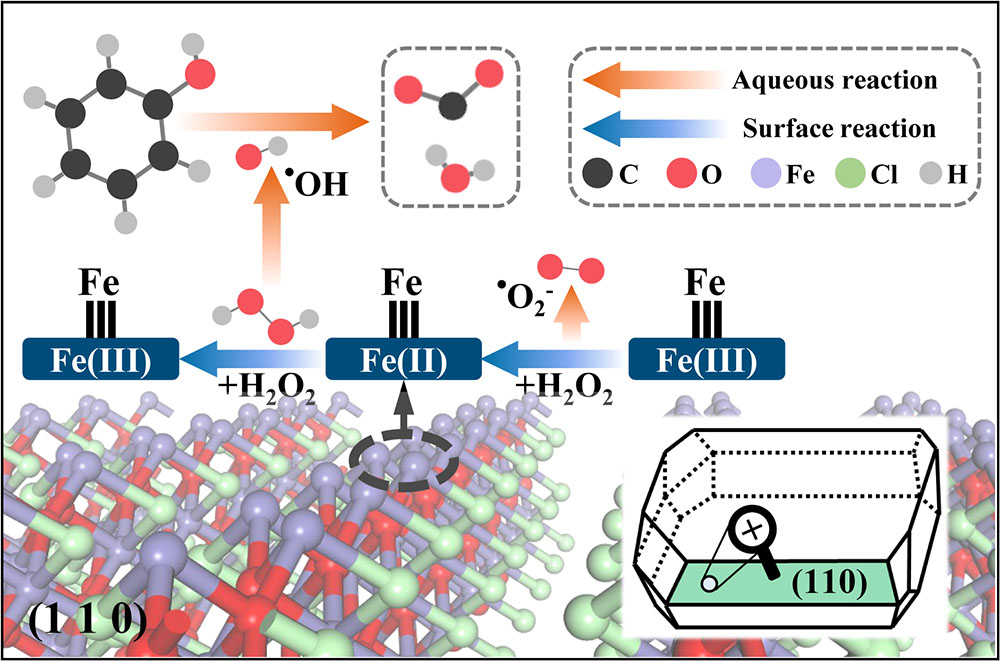 Iron oxychloride (FeOCl) is a unique layered material with tunable electronic properties. The conventional synthetic route of chemical vapor transition involves a thermodynamics-driven gas–solid interfacial reaction which often generates macroscopic crystals with stable facets. In this study, through analyzing the effects of the synthetic parameters on the FeOCl synthesis, we discovered the dominant contribution of the α-Fe2O3 precursors on the chemical property of the FeOCl product, and subsequently developed a highly-controllable synthetic route of tailoring the FeOCl structures into small sizes and exposed high-energy facets via a facile and scalable mechanical-chemical approach. The synthesized products could be systematically tuned by the ball-milling conditions of the α-Fe2O3 precursors. With increased milling time, the FeOCl crystallites demonstrated reduced sizes and more exposed (110) facets. Intriguingly, these small-sized FeOCl catalysts exhibited much faster Fenton-like kinetics than the pristine macroscopic FeOCl materials. Specifically, FeOCl catalysts with a 12-hour milling time showed nearly 39 times higher efficiency toward phenol degradation than the pristine FeOCl. The structure-reactivity relationship was further elucidated using the combinatory analysis via density functional theory calculation, electron paramagnetic resonance and radical quenching probe experiments. This work provides a rationale for tailoring the surface structures of FeOCl crystallites for potential applications in environmental catalysis.