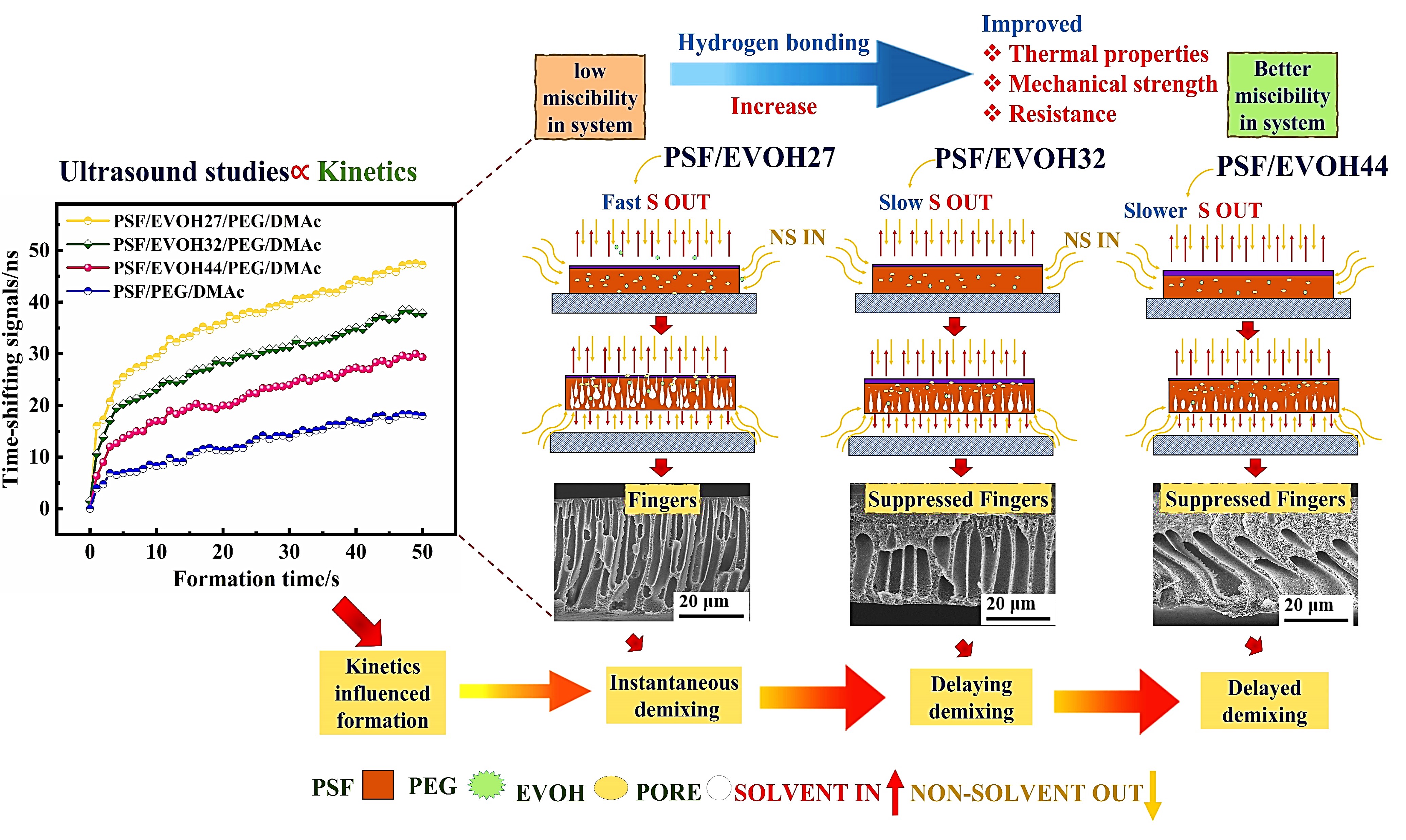 Various hydrophilic poly(ethylene-co-vinyl alcohol) (EVOH) were used herein to precisely control the structure and hydrodynamic properties of polysulfone (PSF) membranes. Particularly, to prepare pristine PSF and PSF/EVOH blends with increasing vinyl alcohol (VOH: 73%, 68%, 56%), the non-solvent-induced phase separation (NIPS) technique was used. Polyethylene glycol was used as a compatibilizer and as a porogen in N,N-dimethylacetamide. Rheological and ultrasonic separation kinetic measurements were also carried out to develop an ultrafiltration membrane mechanism. The extracted membrane properties and filtration capabilities were systematically compared to the proposed mechanism. Accordingly, the addition of EVOH led to an increase in the rheology of the dopes. The resulting membranes exhibited a microporous structure, while the finger-like structures became more evident with increasing VOH content. The PSF/EVOH behavior was changed from immediate to delayed segregation due to a change in the hydrodynamic kinetics. Interestingly, the PSF/EVOH32 membranes showed high hydrophilicity and achieved a pure water permeability of 264 L·m–2·h–1·bar–1, which was higher than that of pure PSF membranes (171 L·m–2·h–1·bar–1). In addition, PSF/EVOH32 rejected bovine serum albumin at a high rate (> 90%) and achieved a significant restoration of permeability. Finally, from the thermodynamic and hydrodynamic results, valuable insights into the selection of hydrophilic copolymers were provided to tailor the membrane structure while improving both the permeability and antifouling performance.