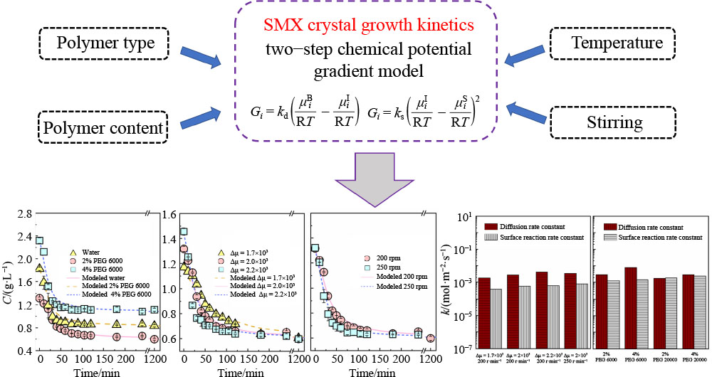 In this work, the influence of the initial chemical potential gradient, stirring speed, and polymer type on sulfamethoxazole (SMX) crystal growth kinetics was systematically investigated through density functional theory (DFT) calculations, experimental measurements and the two-step chemical potential gradient model. To investigate the influence of different conditions on the thermodynamic driving force of SMX crystal growth, SMX solubilities in different polymer solutions were studied. Four model polymers effectively improved SMX solubility. It was further found that polyvinylpyrrolidone (PVP) and hydroxypropyl methyl cellulose (HPMC) played a crucial role in inhibiting SMX crystal growth. However, polyethylene glycol (PEG) promoted SMX crystal growth. The effect of the polymer on the crystal growth mechanisms of SMX was further analyzed by the two-step chemical potential gradient model. In the system containing PEG 6000, crystal growth is dominated by the surface reaction. However, in the system containing PEG 20000, crystal growth is dominated by both the surface reaction and diffusion. In addition, DFT calculations results showed that HPMC and PVP could form strong and stable binding energies with SMX, indicating that PVP and HPMC had the potential ability to inhibit SMX crystal growth.