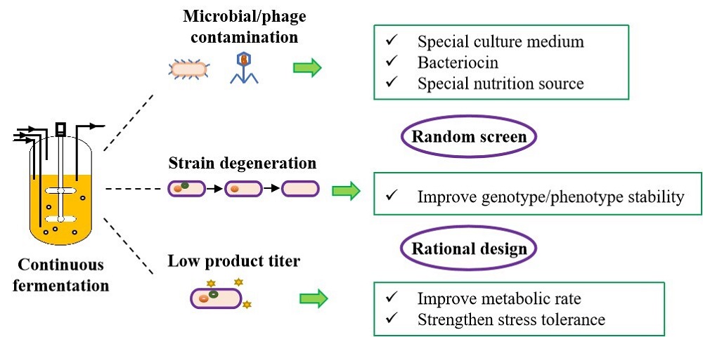 Most current biotechnology industries are based on batch or fed-batch fermentation processes, which often show low productivity and high production costs compared to chemical processes. To increase the economic competitiveness of biological processes, continuous fermentation technologies are being developed that offer significant advantages in comparison with batch/fed-batch fermentation processes, including: (1) removal of potential substrates and product inhibition, (2) prolonging the microbial exponential growth phase and enhancing productivity, and (3) avoiding repeated fermentation preparation and lowering operation and installation costs. However, several key challenges should be addressed for the industrial application of continuous fermentation processes, including (1) contamination of the fermentation system, (2) degeneration of strains, and (3) relatively low product titer. In this study, we reviewed and discussed metabolic engineering and synthetic biology strategies to address these issues.