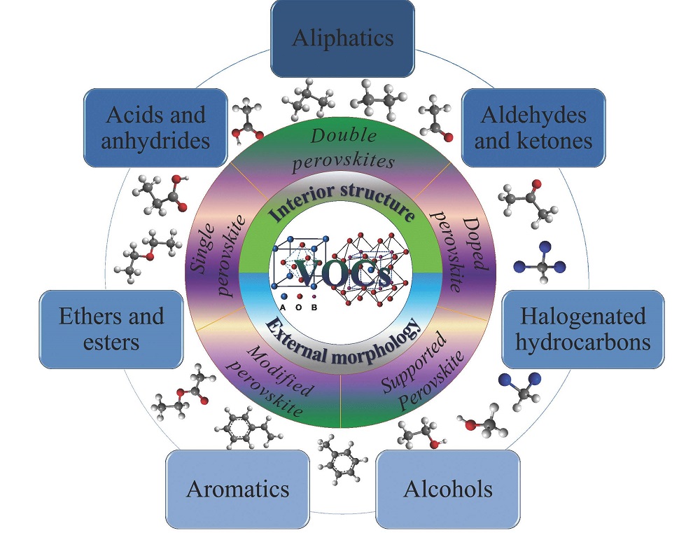 With the rapid development of industry, volatile organic compounds (VOCs) are gaining attention as a class of pollutants that need to be eliminated due to their adverse effects on the environment and human health. Catalytic combustion is the most popular technology used for the removal of VOCs as it can be adapted to different organic emissions under mild conditions. This review first introduces the hazards of VOCs, their treatment technologies, and summarizes the treatment mechanism issues. Next, the characteristics and catalytic performance of perovskite oxides as catalysts for VOC removal are expounded, with a special focus on lattice distortions and surface defects caused by metal doping and surface modifications, and on the treatment of different VOCs. The challenges and the prospects regarding the design of perovskite oxides catalysts for the catalytic combustion of VOCs are also discussed. This review provides a reference base for improving the performance of perovskite catalysts to treat VOCs.