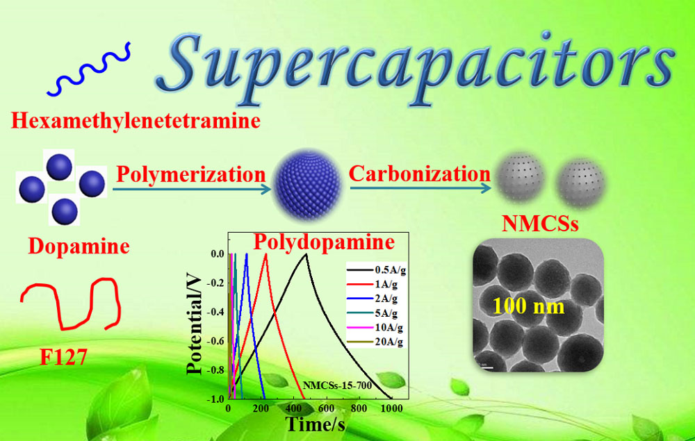 Monodispersed nitrogen-doped carbon nanospheres with tunable particle size (100–230 nm) were synthesized via self-polymerization of biochemical dopamine in the presence of hexamethylenetetramine as a buffer and F127 as a size controlling agent. Hexamethylenetetramine can mildly release NH3, which in turn initiates the polymerization reaction of dopamine. The carbon nanospheres obtained exhibited a significant energy storage capability of 265 F·g–1 at 0.5 A·g–1 and high-rate performance of 82% in 6 mol·L–1 KOH (20 A·g–1), which could be attributed to the presence of abundant micro-mesoporous structure, doped nitrogen functional groups and the small particle size. Moreover, the fabricated symmetric supercapacitor device displayed a high stability of 94% after 5000 cycles, revealing the considerable potential of carbon nanospheres as electrode materials for energy storage.