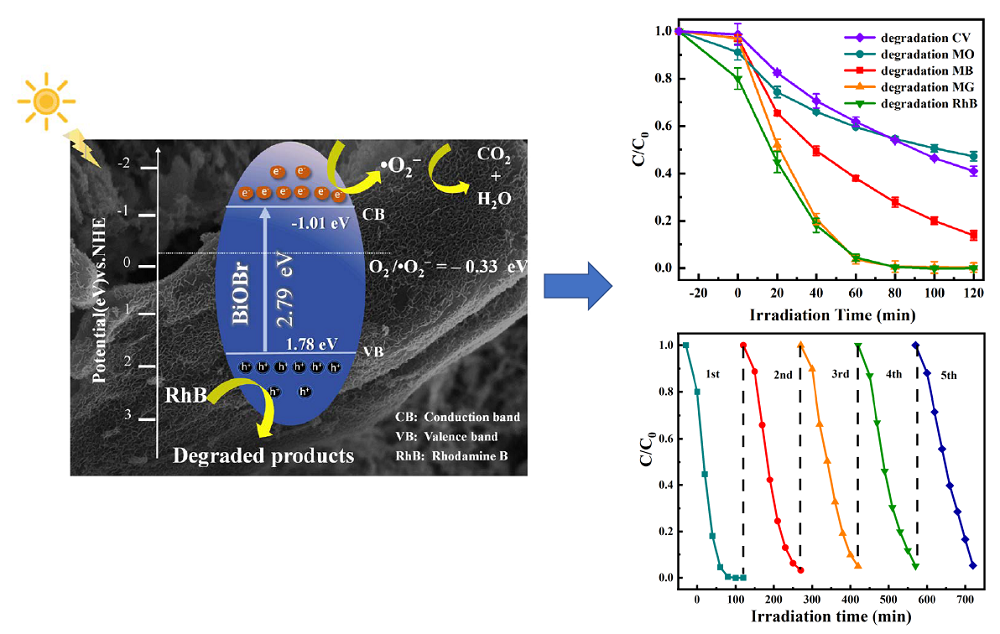 A stable and recyclable of BiOBr/silk fibroin-cellulose acetate composite film was prepared by blending-wet phase transformation and in situ precipitate technology. The cellulose acetate film modified by silk fibroin formed a finger-shaped porous structure, which provided a large space for the uniform growth of BiOBr nanosheets and facilitated the shuttle flow of dyes in film. The morphology, phase structure, and optical properties of the composite films were characterized using various techniques, and their photocatalytic performance for dye wastewater was evaluated under visible light irradiation. Results showed that the BiOBr/SF-CA composite film exhibited efficient photocatalytic activity with 99.9% of rhodamine B degradation rate. Moreover, the composite film maintained high catalytic stability because Bi as the active species deposited on the film showed almost no loss. Finally, the possible photocatalytic mechanisms in the BiOBr/SF-CA composite film were speculated through radical-trapping experiments and electron spin resonance testing.