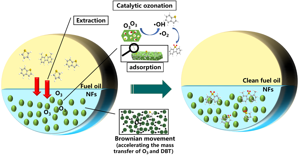 Compared with traditional hydrodesulfurization, new nonhydrodesulfurization methods have the advantage of a high removal efficiency for thiophene compounds under mild conditions. However, independent nonhydrodesulfurization technologies are faced with their own shortcomings, such as limitations of the desulfurization performance and regeneration of materials. To overcome these limitations, four nanofluids were prepared by dispersing different metal-modified MCM-41 particles in deep eutectic solvent as multifunctional promoters to develop a comprehensive desulfurization method. Based on the excellent adsorbability and high catalytic activity of the dispersed particles and the outstanding extractability of deep eutectic solvent in nanofluids, a high sulfur removal of 99.33% was achieved for model oil under mild conditions in 15 min. The nanofluids also showed excellent reusability due to their high structural stability. In addition, NF@Cu/Al-MCM-41-2.5% exhibited the best desulfurization performance among the prepared nanofluids. This result was obtained because the introduction of Al ions increased the number of acid sites and defect sites to improve the catalytic activity and adsorbability, and the best affinity of Cu/Al-MCM-41 for the deep eutectic solvent favored the reaction mass transfer. This work opens the door to the development of a comprehensive nonhydrodesulfurization method based on the design of nanofluid materials.