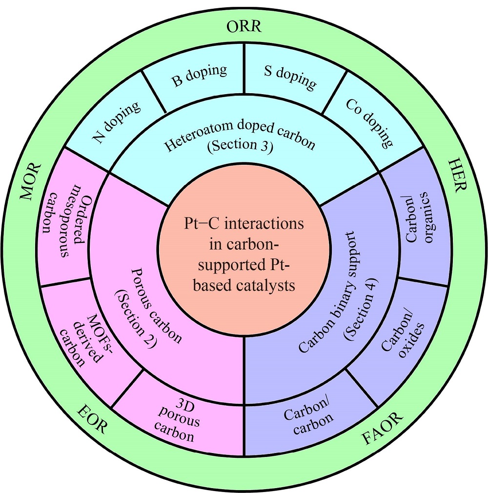 Carbon-supported Pt-based materials are highly promising electrocatalysts. The carbon support plays an important role in the Pt-based catalysts by remarkably influencing the growth, particle size, morphology, dispersion, electronic structure, physiochemical property and function of Pt. This review summarizes recent progress made in the development of carbon-supported Pt-based catalysts, with special emphasis being given to how activity and stability enhancements are related to Pt–C interactions in various carbon supports, including porous carbon, heteroatom doped carbon, carbon-based binary support, and their corresponding electrocatalytic applications. Finally, the current challenges and future prospects in the development of carbon-supported Pt-based catalysts are discussed.