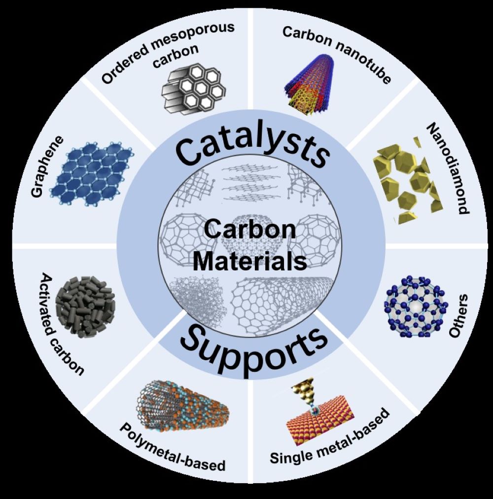 Direct dehydrogenation with high selectivity and oxidative dehydrogenation with low thermal limit has been regarded as promising methods to solve the increasing demands of light olefins and styrene. Metal-based catalysts have shown remarkable performance for these reactions, such as Pt, CrOx, Co, ZrOx, Zn and V. Compared with metal-based catalysts, carbon materials with stable structure, rich pore texture and large surface area, are ideal platforms as the catalysts and the supports for dehydrogenation reactions. In this review, carbon materials applied in direct dehydrogenation and oxidative dehydrogenation reactions including ordered mesoporous carbon, carbon nanodiamond, carbon nanotubes, graphene and activated carbon, are summarized. A general introduction to the dehydrogenation mechanism and active sites of carbon catalysts is briefly presented to provide a deep understanding of the carbon-based materials used in dehydrogenation reactions. The unique structure of each carbon material is presented, and the diversified synthesis methods of carbon catalysts are clarified. The approaches for promoting the catalytic activity of carbon catalysts are elaborated with respect to preparation method optimization, suitable structure design and heteroatom doping. The regeneration mechanism of carbon-based catalysts is discussed for providing guidance on catalytic performance enhancement. In addition, carbon materials as the support of metal-based catalysts contribute to exploiting the excellent catalytic performance of catalysts due to superior structural characteristics. In the end, the challenges in current research and strategies for future improvements are proposed.