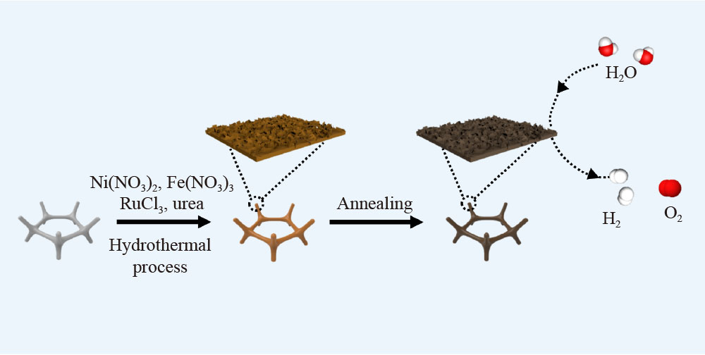 The electrocatalyst NiFeRuOx/NF, comprised of NiFeRuOx nanosheets grown on Ni foam, was synthesized using a hydrothermal process followed by thermal annealing. NiFeRuOx/NF displays high electrocatalytic activity and stability for overall alkaline seawater splitting: 98 mV@ 10 mA∙cm−2 in hydrogen evolution reaction, 318 mV@ 50 mA∙cm−2 in oxygen evolution reaction, and a cell voltage of 1.53 V@ 10 mA∙cm−2, as well as 20 h of durability. A solar-driven system containing such a bifunctional NiFeRuOx/NF has an almost 100% Faradaic efficiency. The NiFeRuOx coating around Ni foam is an anti-corrosion layer and also a critical factor for enhancement of bifunctional performances.