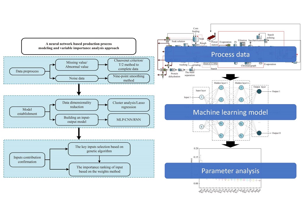 Corn to sugar process has long faced the risks of high energy consumption and thin profits. However, it’s hard to upgrade or optimize the process based on mechanism unit operation models due to the high complexity of the related processes. Big data technology provides a promising solution as its ability to turn huge amounts of data into insights for operational decisions. In this paper, a neural network-based production process modeling and variable importance analysis approach is proposed for corn to sugar processes, which contains data preprocessing, dimensionality reduction, multilayer perceptron/convolutional neural network/recurrent neural network based modeling and extended weights connection method. In the established model, dextrose equivalent value is selected as the output, and 654 sites from the DCS system are selected as the inputs. LASSO analysis is first applied to reduce the data dimension to 155, then the inputs are dimensionalized to 50 by means of genetic algorithm optimization. Ultimately, variable importance analysis is carried out by the extended weight connection method, and 20 of the most important sites are selected for each neural network. The results indicate that the multilayer perceptron and recurrent neural network models have a relative error of less than 0.1%, which have a better prediction result than other models, and the 20 most important sites selected have better explicable performance. The major contributions derived from this work are of significant aid in process simulation model with high accuracy and process optimization based on the selected most important sites to maintain high quality and stable production for corn to sugar processes.