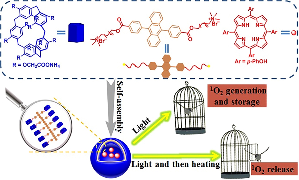 The storage and controlled release of singlet oxygen (1O2) have attracted increasing attention due to the wide application and microsecond lifetime of 1O2 in water. Herein we provide an integrated nanoplatform consisting of a diphenylanthracene derivative, a water-soluble pillar[5]arene and a photosensitizer tetrakis(4-hydroxyphenyl)porphyrin (TPP), that may provide the controlled generation, storage and release of singlet oxygen. We design a new diphenylanthracene derivative with two trimethylammonium bromide groups on both ends that can be well recognized by the pillar[5]arene. The formed nanocarriers can be used to load TPP through their supramolecular self-assembly. The resulting nanoparticles show good water-solubility and uniform spherical morphology. After laser irradiation (660 nm), the nanoparticles exhibit excellent ability for the generation and storage of 1O2. When the irradiated nanoparticles are heated above 80 °C, 1O2 can be released from the system. Therefore, in this paper we pioneer the use of noncovalent interaction to integrate the diphenylanthracene derivatives and photosensitizers into one functional system, which provides a new strategy for the controlled generation, storage and release of singlet oxygen. We believe this groundbreaking strategy will have a great potential in providing necessary amounts of 1O2 for the photodynamic therapy of tumors in dark.