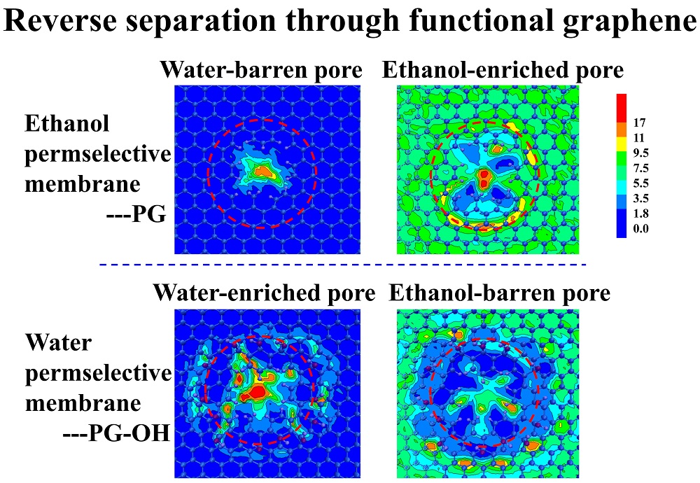 Reverse-selective membranes have attracted considerable interest for bioethanol production. However, to date, the reverse-separation performance of ethanol/water is poor and the separation mechanism is unclear. Graphene-based membranes with tunable apertures and functional groups have shown substantial potential for use in molecular separation. Using molecular dynamics simulations, for the first time, we reveal two-way selectivity in ethanol/water separation through functional graphene membranes. Pristine graphene (PG) exhibits reverse-selective behavior with higher ethanol fluxes than water, resulting from the preferential adsorption for ethanol. Color flow mappings show that this ethanol-permselective process is initiated by the presence of ethanol-enriched and water-barren pores; this has not been reported in previous studies. In contrast, water molecules are preferred for hydroxylated graphene membranes because of the synergistic effects of molecular sieving and functional-group attraction. A simulation of the operando condition shows that the PG membrane with an aperture size of 3.8 Å achieves good separation performance, with an ethanol/water separation factor of 34 and a flux value of 69.3 kg∙m‒2∙h‒1∙bar‒1. This study provides new insights into the reverse-selective mechanism of porous graphene membranes and a new avenue for efficient biofuel production.
