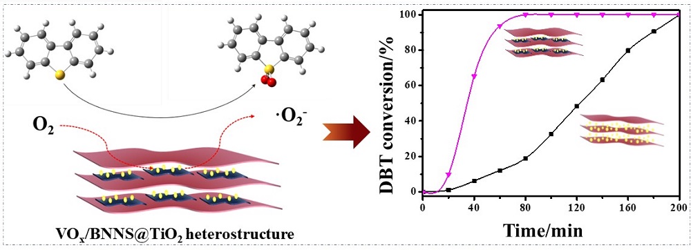 Particle size governs the electronic and geometric structure of metal nanoparticles (NPs), shaping their catalytic performances in heterogeneous catalysis. However, precisely controlling the size of active metal NPs and thereafter their catalytic activities remain an affordable challenge in ultra-deep oxidative desulfurization (ODS) field. Herein, a series of highly-efficient VOx/boron nitride nanosheets (BNNS)@TiO2 heterostructures, therein, cetyltrimethylammonium bromide cationic surfactants serving as intercalation agent, BNNS and MXene as precursors, with various VOx NP sizes were designed and controllably constructed by a facile intercalation confinement strategy. The properties and structures of the prepared catalysts were systematically characterized by different technical methods, and their catalytic activities were investigated for aerobic ODS of dibenzothiophene (DBT). The results show that the size of VOx NPs and V5+/V4+ play decisive roles in the catalytic aerobic ODS of VOx/BNNS@TiO2 catalysts and that VOx/BNNS@TiO2-2 exhibits the highest ODS activity with 93.7% DBT conversion within 60 min under the reaction temperature of 130 °C and oxygen flow rate of 200 mL·min–1, which is due to its optimal VOx dispersion, excellent reducibility and abundant active species. Therefore, the finding here may contribute to the fundamental understanding of structure-activity in ultra-deep ODS and inspire the advancement of highly-efficient catalyst.