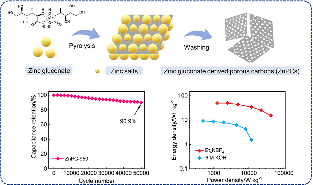 Porous carbons with high specific area surfaces are promising electrode materials for supercapacitors. However, their production usually involves complex, time-consuming, and corrosive processes. Hence, a straightforward and effective strategy is presented for producing highly porous carbons via a self-activation procedure utilizing zinc gluconate as the precursor. The volatile nature of zinc at high temperatures gives the carbons a large specific surface area and an abundance of mesopores, which avoids the use of additional activators and templates. Consequently, the obtained porous carbon electrode delivers a satisfactory specific capacitance and outstanding cycling durability of 90.9% after 50000 cycles at 10 A∙g–1. The symmetric supercapacitors assembled by the optimal electrodes exhibit an acceptable rate capability and a distinguished cycling stability in both aqueous and ionic liquid electrolytes. Accordingly, capacitance retention rates of 77.8% and 85.7% are achieved after 50000 cycles in aqueous alkaline electrolyte and 10000 cycles in ionic liquid electrolyte. Moreover, the symmetric supercapacitors deliver high energy/power densities of 49.8 W∙h∙kg–1/2477.8 W∙kg–1 in the Et4NBF4 electrolyte, outperforming the majority of previously reported porous carbon-based symmetric supercapacitors in ionic liquid electrolytes.
