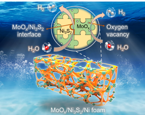 High-performance and ultra-durable electrocatalysts are vital for hydrogen evolution reaction (HER) during water splitting. Herein, by one-pot solvothermal method, MoOx/Ni3S2 spheres comprising Ni3S2 nanoparticles inside and oxygen-deficient amorphous MoOx outside in situ grow on Ni foam (NF), to assembly the heterostructure composites of MoOx/Ni3S2/NF. By adjusting volume ratio of the solvents of ethanol to water, the optimized MoOx/Ni3S2/NF-11 exhibits the best HER performance, requiring an extremely low overpotential of 76 mV to achieve the current density of 10 mA∙cm‒2 (η10 = 76 mV) and an ultra-small Tafel slope of 46 mV∙dec‒1 in 0.5 mol∙L‒1 H2SO4. More importantly, the catalyst shows prominent high catalytic stability for HER (> 100 h). The acid-resistant MoOx wraps the inside Ni3S2/NF to ensure the high stability of the catalyst under acidic conditions. Density functional theory calculations confirm that the existing oxygen vacancy and MoOx/Ni3S2 heterostructure are both beneficial to the reduced Gibbs free energy of hydrogen adsorption (|∆GH*|) over Mo sites, which act as main active sites. The heterostructure effectively decreases the formation energy of O vacancy, leading to surface reconstruction of the catalyst, further improving HER performance. The MoOx/Ni3S2/NF is promising to serve as a highly effective and durable electrocatalyst toward HER.