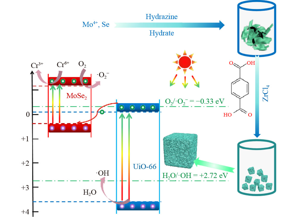 Metal–organic frameworks are recognized as promising multifunctional materials, especially metal–organic framework-based photocatalysts, which are considered to be ideal photocatalytic materials. Herein, a new type of UiO-66/MoSe2 composite was prepared using the solvothermal method. The optimum composite was selected by adjusting the mass ratio of UiO-66 and MoSe2. X-ray diffraction analysis showed that the mass ratio influenced the crystal plane exposure rate of the composite, which may have affected its photocatalytic performance. The composite is composed of ultra-thin flower-like MoSe2 that wrapped around cubic UiO-66, a structure that increases the abundance of active sites for reactions and is more conducive to the separation of carriers. The photocatalytic properties of the composite were evaluated by measuring the degradation rate of Rhodamine B and the catalyst’s ability to reduce Cr(VI)-containing wastewater under visible light irradiation. Rhodamine B was decolorized completely in 120 min, and most of the Cr(VI) was reduced within 150 min. The photochemical mechanism of the complex was studied in detail. The existence of Mo6+ and oxygen vacancies, in addition to the Z-type heterojunction promote the separation of electrons and holes, which enhances the photocatalytic effect.