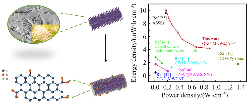 The bind-free carbon cloth-supported electrodes hold the promises for high-performance electrochemical capacitors with high specific capacitance and good cyclic stability. Considering the close connection between their performance and the amount of carbon material loaded on the electrodes, in this work, NiCo2O4 nanowires were firstly grown on the substrate of active carbon cloth to provide the necessary surface area in the longitudinal direction. Then, the quinone-rich nitrogen-doped carbon shell structure was formed around NiCo2O4 nanowires, and the obtained composite was used as electrode for electric double layer capacitor. The results showed that the composite electrode displayed an area-specific capacitance of 1794 mF∙cm–2 at the current density of 1 mA∙cm–2. The assembled symmetric electric double layer capacitor achieved a high energy density of 6.55 mW∙h∙cm–3 at a power density of 180 mW∙cm–3. The assembled symmetric capacitor exhibited a capacitance retention of 88.96% after 10000 charge/discharge cycles at the current density of 20 mA∙cm–2. These results indicated the potentials in the preparation of the carbon electrode materials with high energy density and good cycling stability.