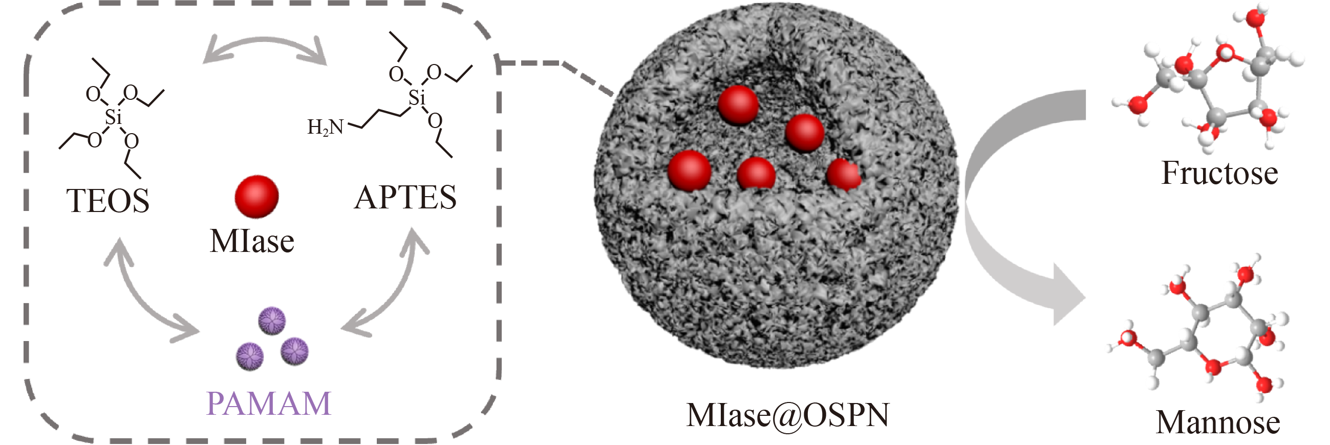 Organic matter-induced mineralization is a green and versatile method for synthesizing hybrid nanostructured materials, where the material properties are mainly influenced by the species of natural biomolecules, linear synthetic polymer, or small molecules, limiting their diversity. Herein, we adopted dendrimer poly(amidoamine) (PAMAM) as the inducer to synthesize organosilica-PAMAM network (OSPN) capsules for mannose isomerase (MIase) encapsulation based on a hard-templating method. The structure of OSPN capsules can be precisely regulated by adjusting the molecular weight and concentration of PAMAM, thereby demonstrating a substantial impact on the kinetic behavior of the MIase@OSPN system. The MIase@OSPN system was used for catalytic production of mannose from D-fructose. A mannose yield of 22.24% was obtained, which is higher than that of MIase in organosilica network capsules and similar to that of the free enzyme. The overall catalytic efficiency (kcat/Km) of the MIase@OSPN system for the substrate D-fructose was up to 0.556 s−1·mmol−1·L. Meanwhile, the MIase@OSPN system showed excellent stability and recyclability, maintaining more than 50% of the yield even after 12 cycles.