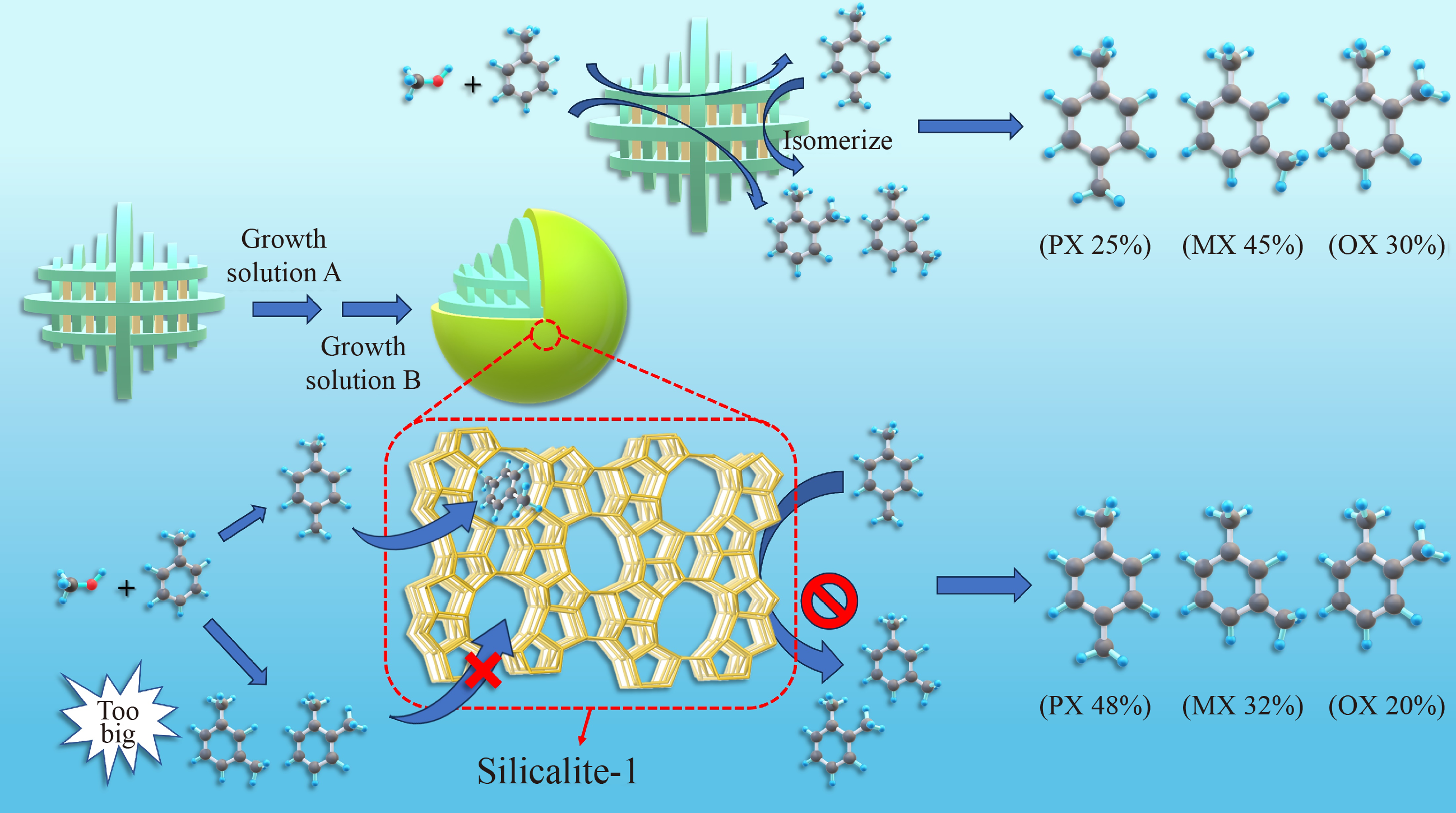 The fabrication of suitable MFI zeolites to effectively produce para-xylene through the alkylation between toluene and methanol is highly desired. Here, the two-dimensional pillared MFI zeolite was modified by silicalite-1, and its morphology and structure were systematically investigated by tuning the concentration of Si species during the secondary crystallization process. The MFI zeolites were characterized by X-ray diffraction, transmission electron microscopy, pyridine-infrared and N2 adsorption-desorption isotherms. The characterization results showed that the external Brønsted acid sites of surface passivated P-MFI-x samples have been successfully shielded. Interestingly, the P-MFI-23 showed long lifetime and high selectivity of para-xylene (about 35%) based on the cooperation between opened interlamellar structure and passivated silicalite-1 layer. It was found that the accumulated hard coke in the interior of MFI zeolites not only blocked the channels of zeolites but also covered the acidic sites, resulting in the deactivation of catalyst. Furthermore, the highest selectivity of para-xylene (about 48%) can be achieved for P-MFI-30 under harsh reaction condition, which also exhibited excellent regeneration property in the alkylation reaction between toluene and methanol. The strategy described in present research may open a window for the design of other advanced materials.